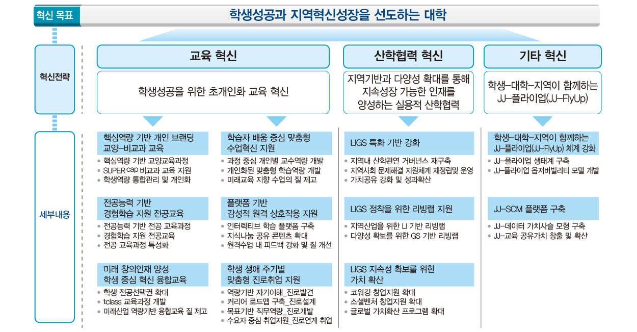 전주대학교 대학혁신지원사업단은 대학의 「중장기발전계획」을 토대로 제4차 산업혁명의 본격적 대비를 위하여 대학의 기본역량 향상 및 강화에 끊임없이 노력하고 있으며, 대학 스스로의 경쟁력 강화를 위한 혁신과제를 선정하고 교육・산학협력・기타 지원시스템 전반에 걸친 혁신 모형을 창출하고 있습니다.
